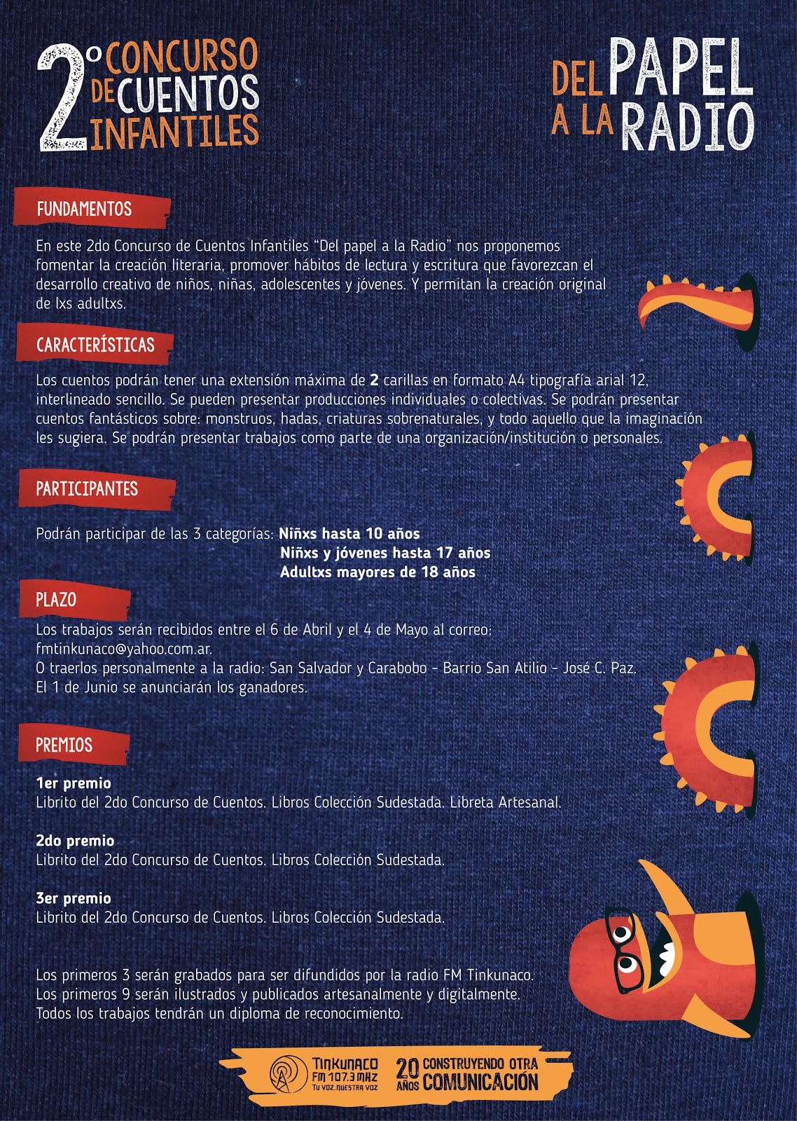 Recordamos que este 2do Concurso de Cuentos Infantiles forma parte de las actividades que la FM Tinkunaco llevará adelante, en este 2018, en el marco de sus 20 años.