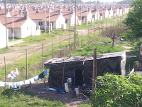 En la foto se observa el contraste ridiculo, una casa muy precaria a la vera de las mil viviendas sin habitar.