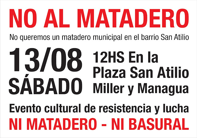 Por todo esto desde la COMISION VECINAL SAN ATILIO DICE NO AL MATADERO invitamos a todos los vecinos de José C Paz el sábado 13 de agosto al Encuentro Cultural de Lucha y Resistencia al matadero que se llevará a cabo en la plaza del barrio San Atilio a partir de las 12 hs. Porque la única lucha que se pierde es la que se abandona.