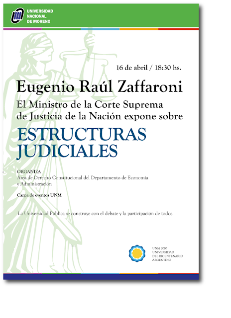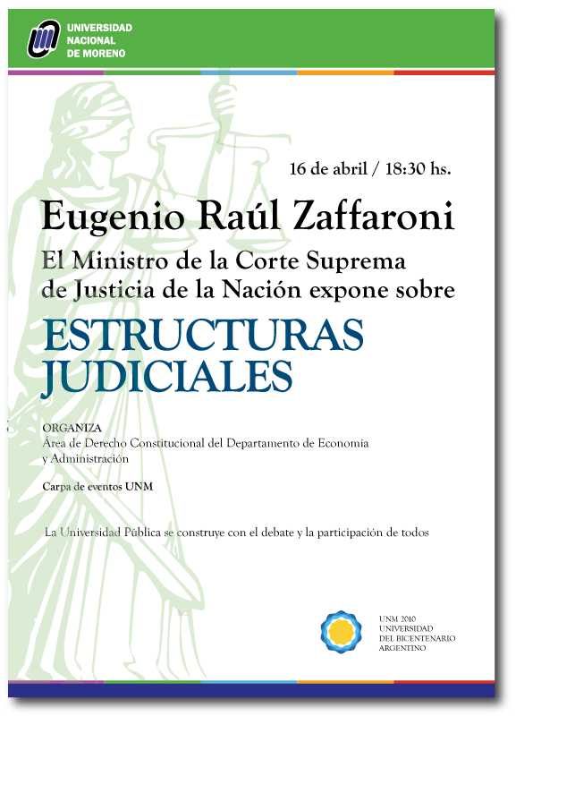 El día martes 16 de abril, a las 18: 30 hs, la Universidad Nacionalde Moreno (UNM) recibirá al Ministro de la Corte Suprema de Justicia de la Nación, el Dr. Eugenio Zaffaroni, quien expondrá sobre “Estructuras Judiciales”.