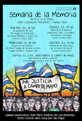 Del 19 al 23 de marzo se desarrollará en la UNGS la Semana de la Memoria, en conmemoración de un nuevo aniversario del golpe militar de 1976. A partir del trabajo colectivo con diversos actores y organizaciones sociales se desarrollarán las siguientes actividades, todas con entrada libre y gratuita:
