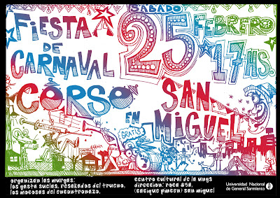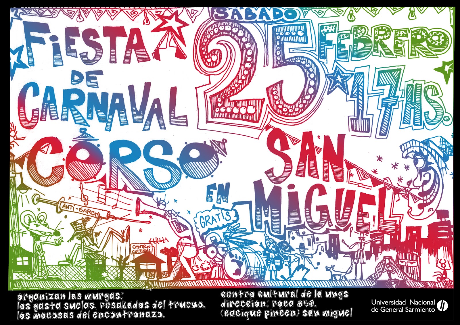 El día sábado 25 de febrero se realizará el Carnaval “Encuentro de Murgas” en el Centro Cultural UNGS (Cacique Pincén -ex Roca- esquina Muñoz).