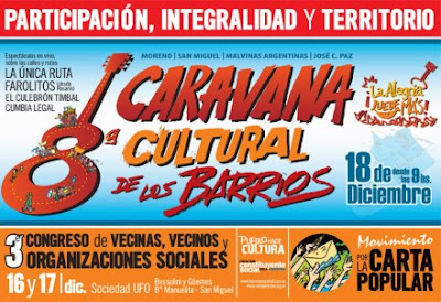El movimiento de la carta popular “es una red de organizaciones sociales que expresan la voluntad política de participación y protagonismos de los sectores populares”. Este año la carta cumple 5 años de vida; y en este marco están organizando, para los días viernes 16 y sábado 17 de diciembre, un congreso regional en el que los ejes de discusión y construcción colectiva giraran alrededor de la “participación, integralidad y territorio”.