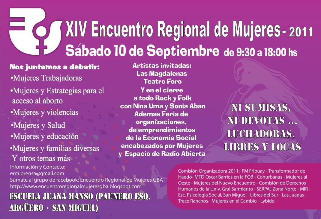 Para más información ingresa a www.encuentroregionalmujeresgba.blogspot.com