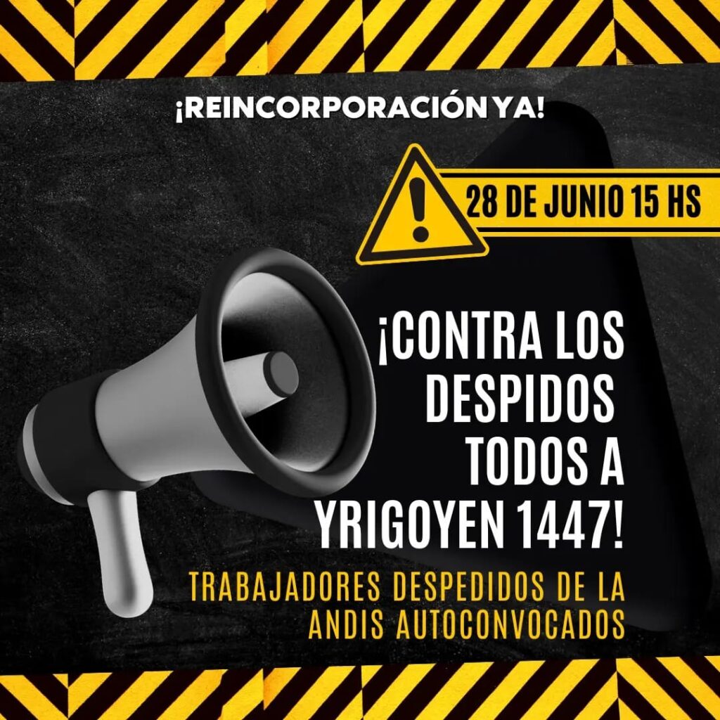 Trabajadores despedidos autoconvocades de la Agencia Nacional de Discapacidad (ANDIS) invitan a una radio abierta el viernes 28 de junio a las 15h en Yrigoyen 1447, CABA. Denuncian despidos arbitrarios y reclaman la reincorporación de sus trabajos y tareas.